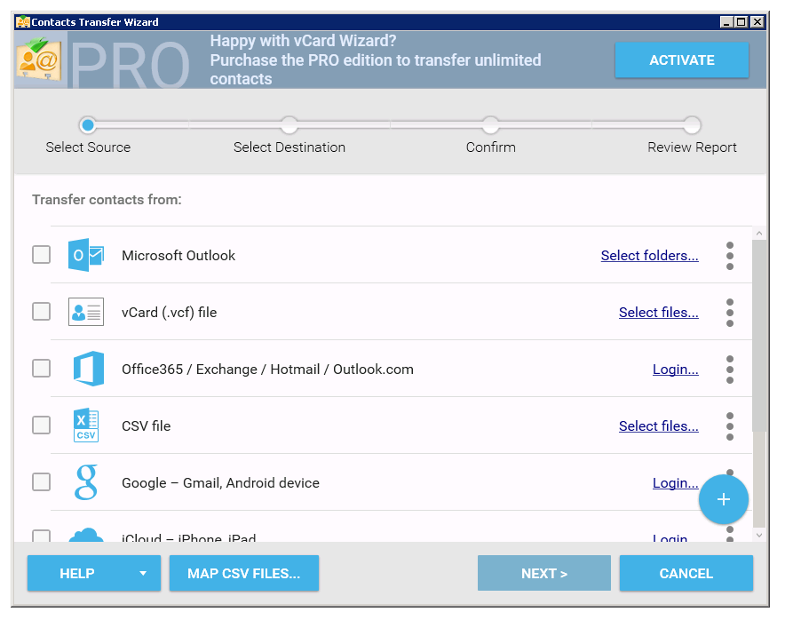 Особенностью vCard Wizard является встроенный пошаговый мастер, который шаг за шагом направляет пользователя через все этапы операций с контактами