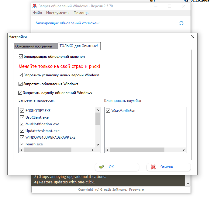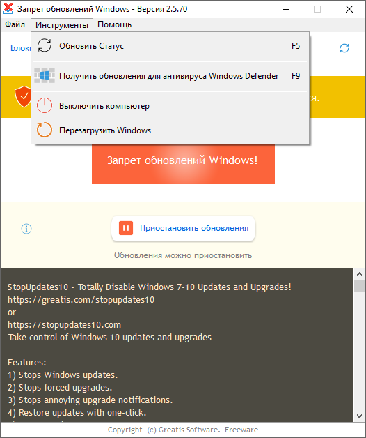 - Позволяет полностью остановить автоматические обновления Windows 10 и выше