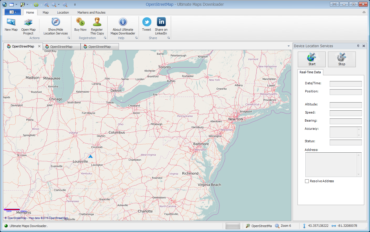 - Поддержка множества картографических серверов, включая Google Maps, Bing Maps и OpenStreetMap