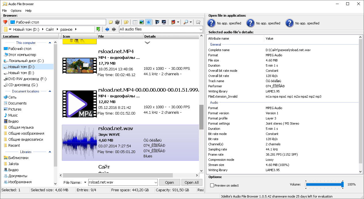 Работа с 3delite Audio File Browser