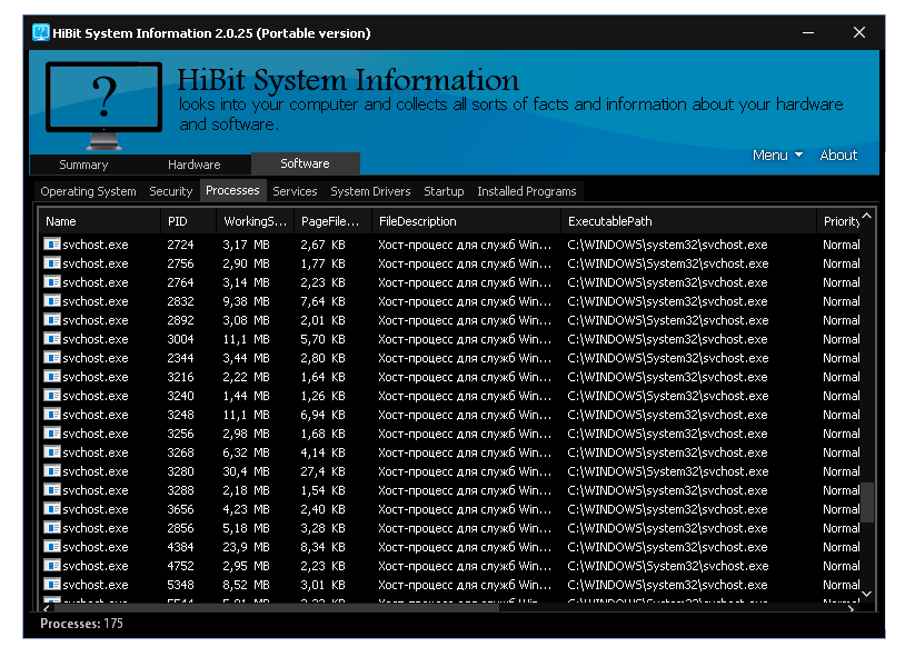 HiBit System Information предоставляет полный обзор конфигурации компьютера, отображая сведения об оборудовании и программной среде в удобно организованном интерфейсе. Приложение разделяет данные на три основные вкладки: оборудование, программное обеспечение и сводка, что упрощает навигацию и поиск нужной информации. Несмотря на отсутствие встроенной русской локализации, интерфейс интуитивно понятен, содержит понятные обозначения и логичную структуру. Утилита собирает данные о центральном процессоре, оперативной памяти, материнской плате, видеокарте, жестких дисках, сетевых адаптерах, установленных драйверах, автозагрузке, запущенных процессах и службах. Это делает её мощным инструментом для диагностики, аудита системы и сравнения конфигураций.