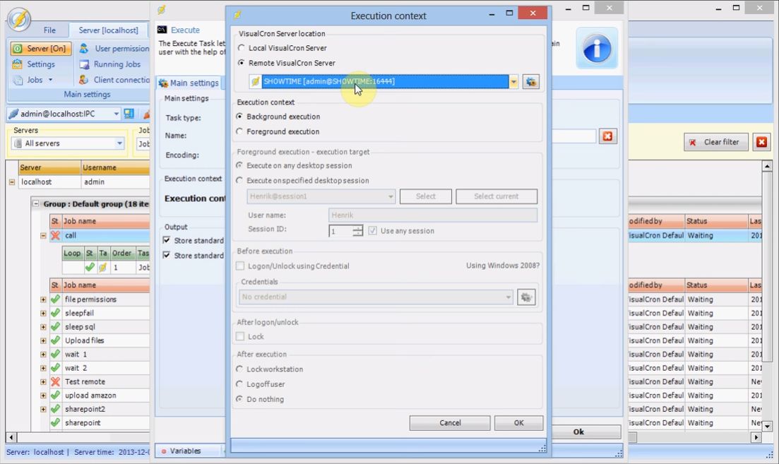 VisualCron представляет собой комплексное решение для автоматизации операций на компьютере или сервере под управлением Windows. Архитектура на основе сервер-клиент позволяет запускать задачи даже при отсутствии активного входа пользователя в систему, так как серверная часть работает как служба Windows. Клиентская часть предоставляет удобный интерфейс для создания, настройки и мониторинга заданий, а также управления соединениями, доступами и уведомлениями. Программа не требует знаний программирования, поскольку вся настройка выполняется через графическое окружение с использованием предопределённых действий.