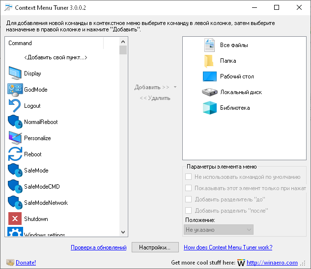 - Полный контроль над пунктом меню: позиция, разделители, поведение при зажатии Shift