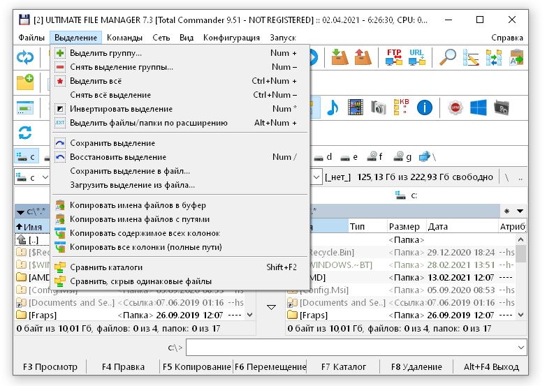 После установки пользователь может сразу приступить к работе с файловой системой, не тратя время на поиск нужных функций. Интерфейс интуитивно понятен: используются классические панели с двумя окнами для быстрого копирования, сравнения и синхронизации папок. Через контекстное меню и горячие клавиши можно быстро открывать встроенные утилиты — например, просмотрщик изображений, менеджер архивов или консоль командной строки. Все настройки централизованы, что позволяет легко менять поведение программы под себя — от внешнего вида до поведения при копировании файлов. Благодаря поддержке плагинов, функционал легко расширяется: добавляются инструменты для поиска дубликатов, просмотра PDF, работы с FTP и многое другое. Работа с сетевыми дисками и облачными хранилищами также поддерживается.