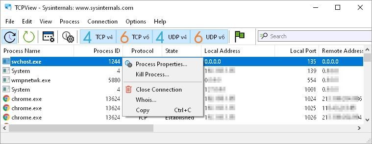Программа интуитивно понятна и не требует специальных знаний для базового использования. После запуска TCPView автоматически сканирует систему и отображает список всех активных соединений. Каждое соединение сопровождается данными о локальном и удалённом адресе, состоянии (например, ESTABLISHED или LISTENING), а также указанием PID и имени процесса, ответственного за подключение. При необходимости пользователь может вручную обновить данные, а также завершить выбранное соединение одним кликом, что особенно удобно при блокировке подозрительных процессов. Утилита также полезна для специалистов по безопасности и системных администраторов, которые могут использовать её для анализа сетевых сбоев и оптимизации производительности.