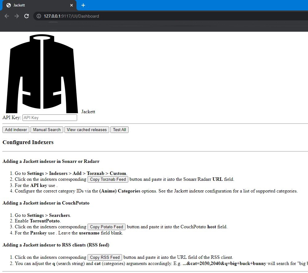 Для корректной работы необходимо указать API-ключ каждого трекера, добавляемого в конфигурацию Jackett
