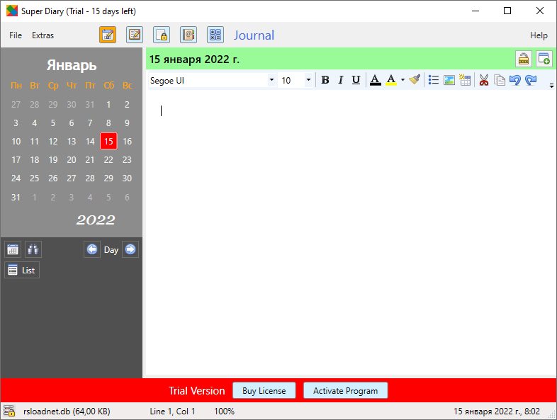 Super Diary представляет собой универсальное приложение, ориентированное на ведение дневника, но с широким функционалом, выходящим за рамки простого хранения текстовых записей. Программа построена на основе защищённой базы данных, доступ к которой возможен только после ввода мастер-пароля. Это обеспечивает конфиденциальность всех хранящихся внутри данных — будь то личные переживания, контактная информация или финансовые операции. Создание diary-записей происходит в удобном текстовом редакторе с минимальным набором инструментов форматирования, поддержкой форматов RTF, TXT и HTML.