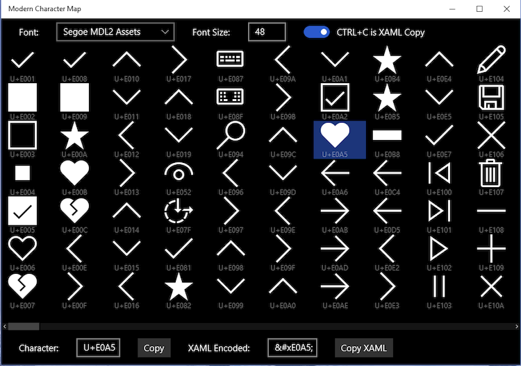 Использование приложения предельно простое: после запуска откроется окно с таблицей символов текущего шрифта. В верхней части расположена панель инструментов, где можно выбрать другой шрифт и изменить его размер отображения. Это особенно полезно при работе с детализированными или декоративными символами. При клике на любой знак программа мгновенно копирует его в буфер обмена и показывает его Unicode-значение, а также XAML-код, если он доступен. Такой подход экономит время при разработке интерфейсов, верстке и написании документации. Поддержка темной темы и четкое оформление позволяют эффективно использовать программу даже в условиях низкой освещенности.