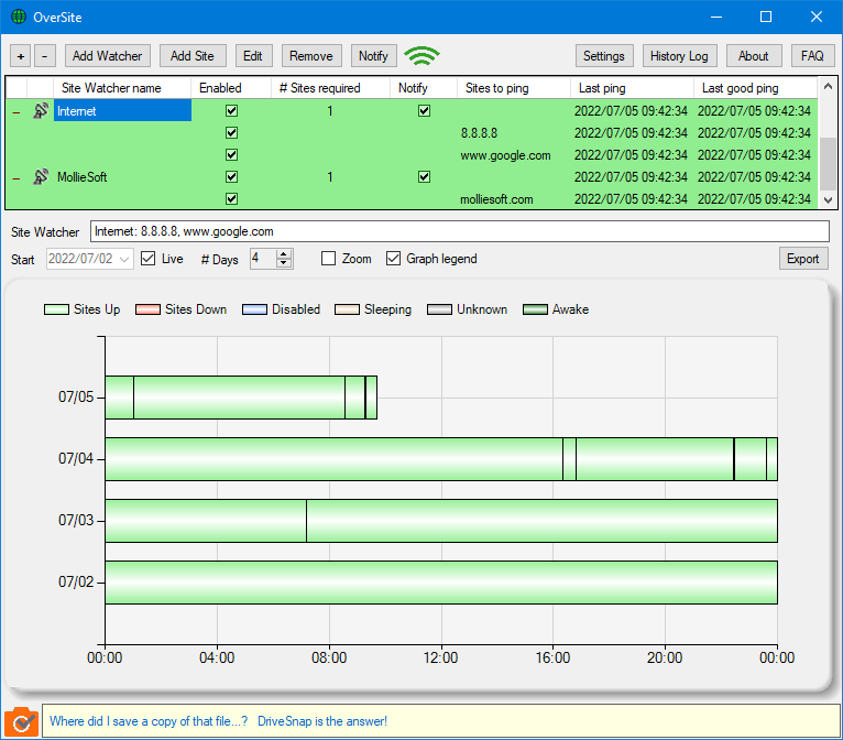 OverSite 1.2.3.0 — это программа для мониторинга интернет-соединения и отслеживания доступности веб-сайтов, разработанная командой MollieSoft. Утилита автоматически проверяет стабильность подключения и фиксирует временные сбои, отображая данные в виде наглядных графиков. Благодаря интуитивному интерфейсу и минимальным требованиям к системе, OverSite подходит как для домашнего, так и для профессионального использования.