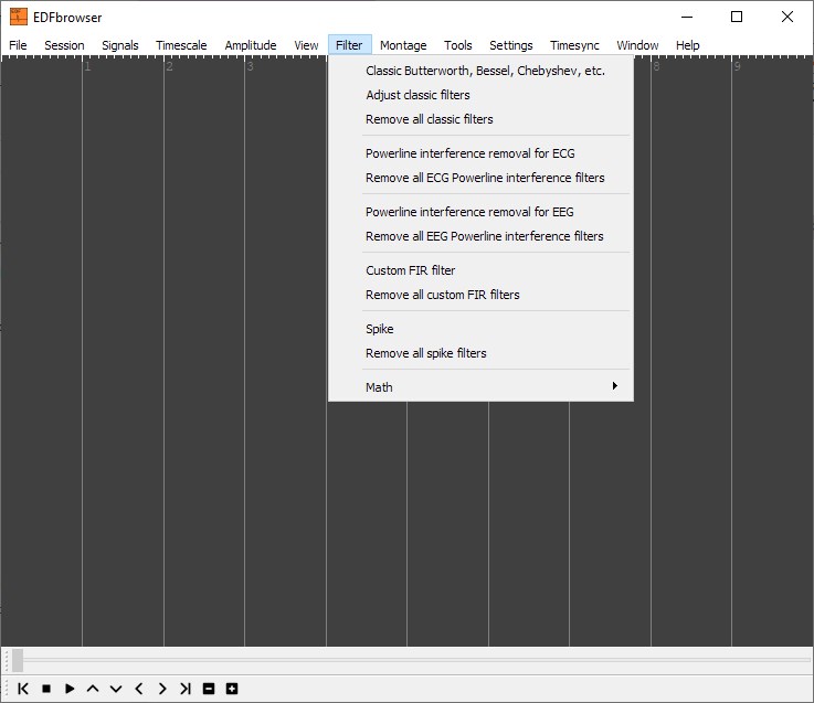 Интерфейс программы организован логично: при открытии файла все каналы отображаются в виде отдельных дорожек. Пользователь может регулировать чувствительность отображения, изменять скорость прокрутки и масштабировать участки сигнала для детального анализа. Реализованы фильтры высоких и низких частот, что особенно важно при устранении помех, возникающих в процессе записи. Добавление аннотаций позволяет быстро отмечать аномальные участки, фиксировать события или делать пометки для последующей интерпретации. Работа с временными метками упрощает анализ длительных записей, например, в процессе полисомнографии. Программа поддерживает drag-and-drop и стандартные действия с файлами, что делает процесс взаимодействия с EDFbrowser максимально удобным. Для пользователей, которым требуется автоматизация, предусмотрены команды, доступные через контекстное меню и комбинации клавиш.