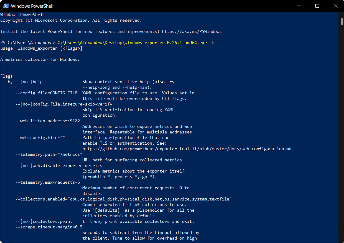 Использование windows_exporter предполагает настройку через командную строку или конфигурационный файл. При запуске вы можете указать, какие именно коллекторы будут активны — например, cpu, memory, system, network, service или disk. Программа прослушивает заданный порт и выдаёт данные в формате, доступном для сбора Prometheus. Настройки можно сохранить в конфигурации, чтобы не вводить параметры каждый раз при запуске. Поддержка флагов позволяет гибко управлять поведением экспортера, включая логирование, уровень детализации и адрес привязки. После запуска вы можете проверить доступность метрик через браузер, открыв соответствующий адрес с портом, указанным в настройках.