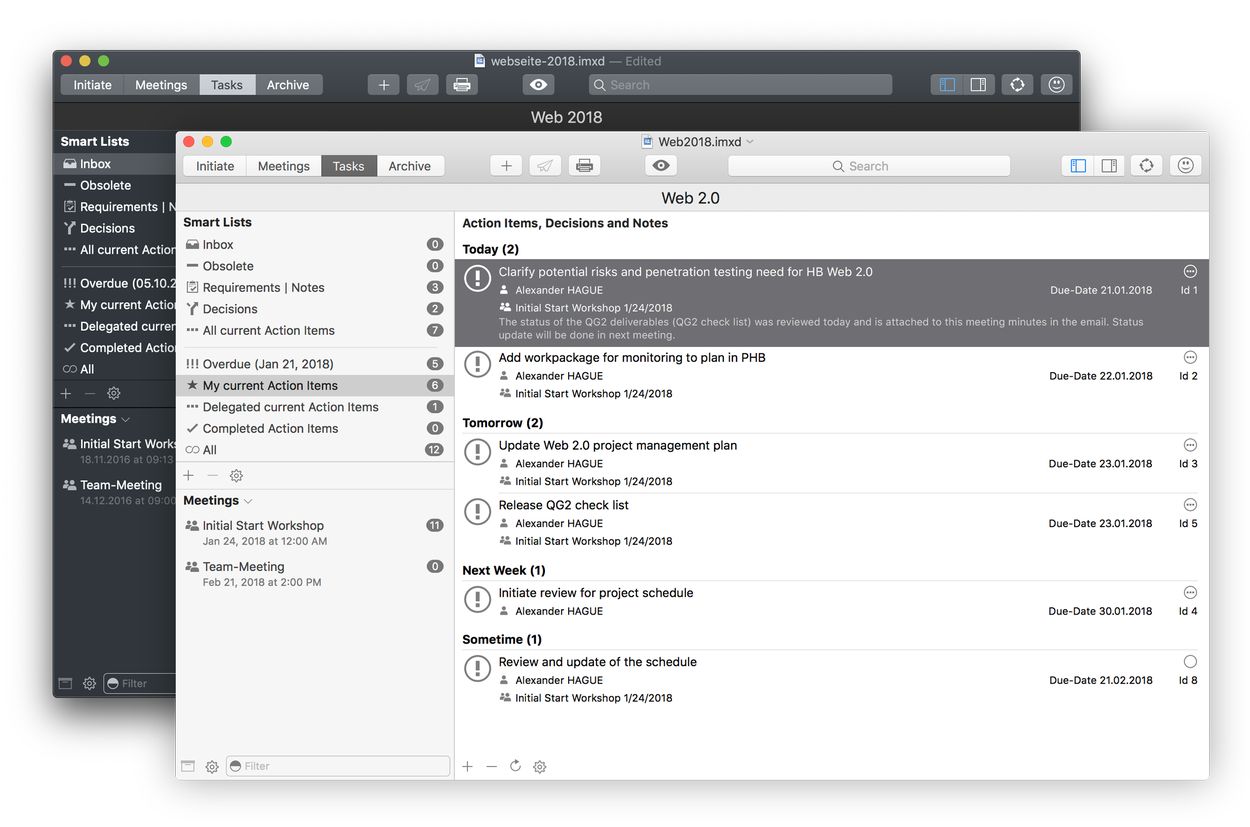 iMeetingX 2.0.9.20 предоставляет комплексное решение для организованной работы в команде. Интерфейс разделён на четыре логические секции, что позволяет быстро ориентироваться в задачах, встречах, проектах и отчётах. Пользователь может создавать новые задачи и встречи с минимальными усилиями — кнопка добавления всегда остаётся в зоне доступа. Каждая запись поддерживает вложение файлов, что избавляет от необходимости хранить документы в отдельных папках или облачных хранилищах. Проекты структурируются с учётом текущих приоритетов, а умные фильтры помогают сосредотачиваться только на актуальных заданиях.