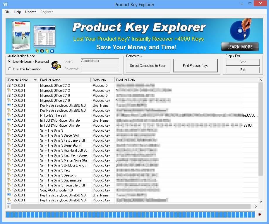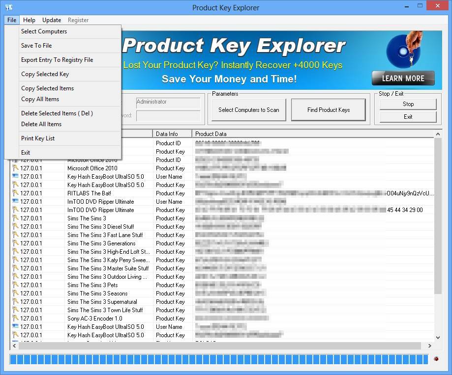 Product Key Explorer — это утилита, предназначенная для поиска и извлечения ключей активации программ, уже установленных на компьютере. Она способна определить более нескольких тысяч приложений, включая продукты Microsoft, Adobe, Autod**sk и другие популярные разработки. После сканирования система отображает список всех обнаруженных продуктов с привязанными к ним лицензионными ключами, что особенно полезно при переустановке системы или миграции данных.