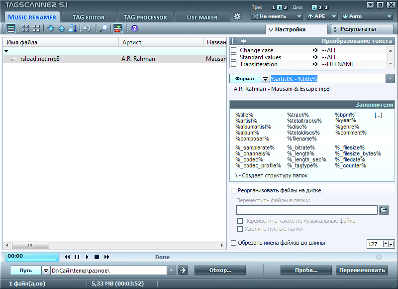 TagScanner — не просто редактор тегов, а полноценная система управления аудиофайлами с широкими возможностями автоматизации.