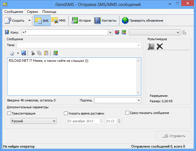 iSendSMS v2.3.5.802 — это утилита для отправки SMS и MMS сообщений с компьютера на мобильные номера любых сотовых операторов России. Программа работает бесплатно, не требует подписок и скрытых платежей, поддерживает портативную версию и полностью адаптирована на русском языке. Благодаря встроенной базе операторов, автоматическому определению провайдера и функции отложенной отправки, iSendSMS становится удобным инструментом для массовых или однократных рассылок.