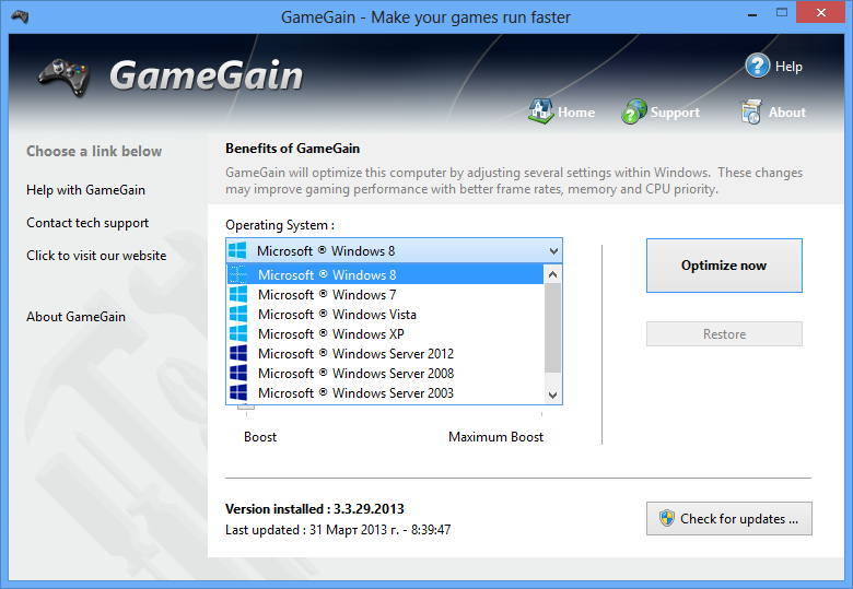 Использование программы не требует специальных знаний. После запуска пользователь видит минималистичное окно с несколькими полями выбора: операционная система, тип процессора и уровень оптимизации. Если вы не знаете модель процессора, можно выбрать пункт «неизвестный», и приложение адаптируется под общие параметры. После подтверждения настроек GameGain вносит изменения в систему, включая корректировку реестра и параметров производительности. Процесс занимает несколько секунд, после чего можно запускать игры и оценить результат. Для отката изменений предусмотрен встроенный инструмент восстановления.