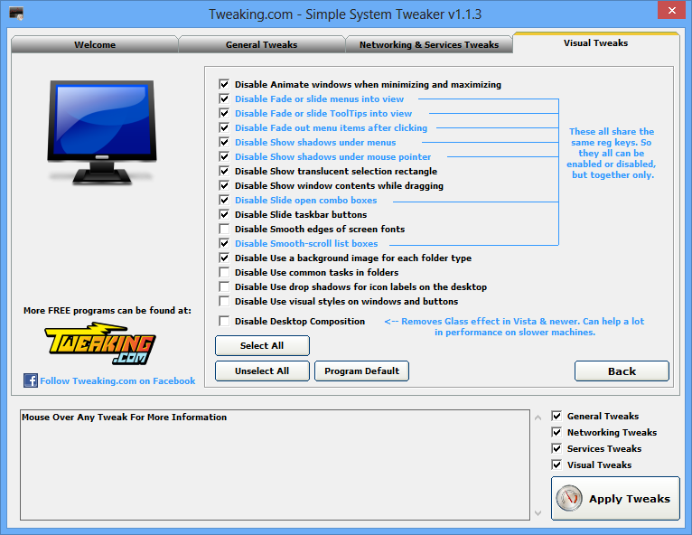 Все изменения, вносимые через Simple System Tweaker, не затрагивают установленные приложения и не нарушают целостность системы.