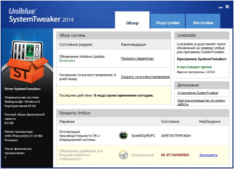 Uniblue SystemTweaker 2016 — это инструмент для тонкой настройки операционной системы Windows, позволяющий оптимизировать производительность, изменить поведение интерфейса и улучшить работу сети. Программа предлагает более 50 системных правок, которые помогают адаптировать Windows под индивидуальные предпочтения пользователя. С её помощью можно ускорить загрузку системы, настроить меню «Пуск» и повысить уровень безопасности.
