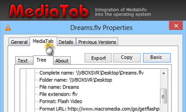 MediaTab 1.4.1 — бесплатное расширение для проводника Windows, добавляющее вкладку с детальной информацией о медиафайлах. Программа отображает параметры видео и аудио: кодеки, контейнер, длительность, битрейт, теги и другие технические характеристики. Установка проста, а функционал полезен для пользователей, часто работающих с мультимедиа.