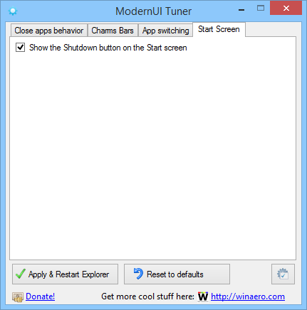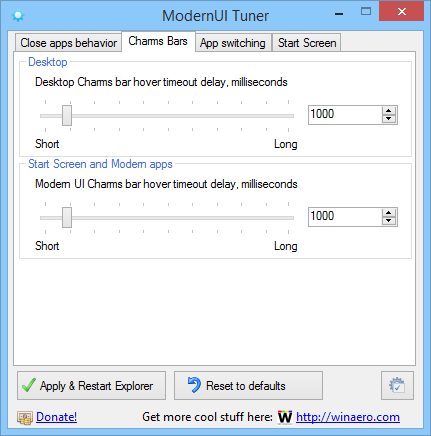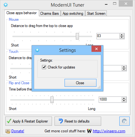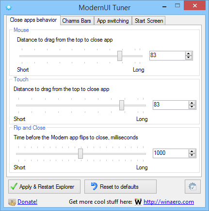 ModernUI Tuner разработана для пользователей, установивших Windows 8.1 Update, и предоставляет доступ к скрытым настройкам интерфейса через простой и интуитивно понятный интерфейс. Утилита не требует установки, работает портативно и вносит изменения в системный реестр, что позволяет быстро применить нужные параметры без перезагрузки системы. Программа затрагивает поведение элементов Metro-интерфейса, включая панель Charms, анимацию закрытия приложений и отклик на жесты мышью и сенсорного экрана.