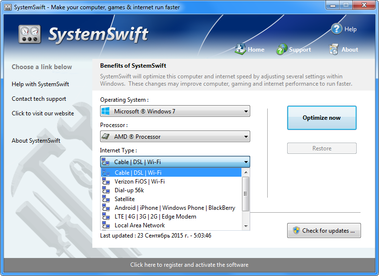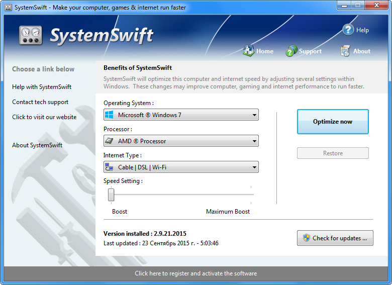SystemSwift представляет собой инструмент, предназначенный для комплексного ускорения работы компьютера. Разработка от PGWARE фокусируется на автоматизации процессов настройки, чтобы пользователь мог получить прирост производительности без глубокого погружения в системные параметры. Интерфейс утилиты выполнен на английском языке, однако наличие русской локализации в сборке упрощает взаимодействие для пользователей из русскоязычных регионов. Программа сочетает в себе функции оптимизации ОС, центрального процессора и сетевых подключений, обеспечивая всесторонний подход к ускорению системы. Несмотря на отсутствие сложных настроек, её алгоритмы затрагивают ключевые компоненты, влияющие на общую отзывчивость компьютера.