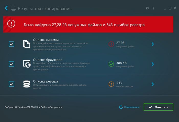 После запуска приложения пользователь видит основной экран с крупной красной кнопкой запуска сканирования. После нажатия открывается выбор компонентов для проверки: диск, браузеры, реестр. Можно отметить все пункты для полной диагностики. Процесс сканирования занимает несколько секунд, в зависимости от загруженности системы. По завершении отображается результат с разбивкой по категориям и количеством найденного мусора. Каждый элемент можно вручную оставить или включить в список на удаление. После подтверждения запускается очистка, после которой система становится чище и отзывчивее. Также доступен инструмент просмотра установленных программ и их деинсталляции без перехода в панель управления.