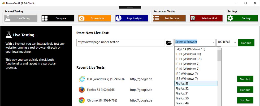 Программа BrowseEmAll Studio предоставляет комплексное решение для тестирования отображения веб-сайтов в разных конфигурациях пользовательских сред. Она позволяет синхронно просматривать одну и ту же страницу в нескольких браузерах, включая различные версии Internet Explorer, Chrome, Firefox и других. Это особенно важно для веб-разработчиков, которым необходимо гарантировать единообразное поведение сайта на всех платформах. Работа с интерфейсом осуществляется через вкладки, что делает навигацию интуитивно понятной и удобной.
