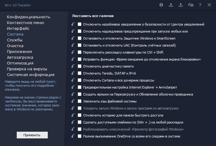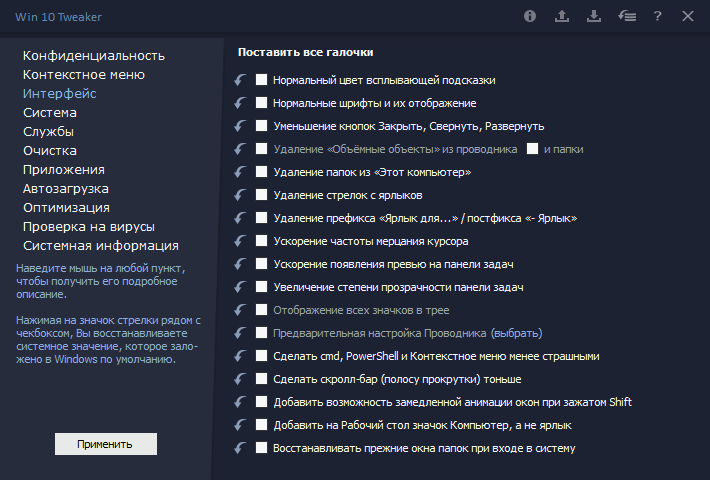 Программа Win 10 Tweaker Pro предназначена для глубокой настройки параметров Windows через удобный графический интерфейс. Она не требует установки — используется в портативном режиме, сразу после распаковки архива можно запускать исполняемый файл. Интерфейс разделён на две части: слева находятся категории настройки, справа — конкретные параметры с возможностью включения или отключения через галочки. Каждый пункт сопровождается подсказкой, что особенно полезно новичкам, не знакомым с внутренним устройством Windows.