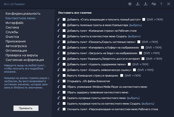 Использование утилиты интуитивно понятно: после запуска файла tweaker.exe появляется окно с древовидной структурой слева. Пользователь выбирает нужный раздел — например, «Приватность», «Производительность» или «Контекстное меню». В правой части отображаются соответствующие пункты, где можно поставить галочку для применения изменений. Для отмены действия достаточно снять флажок. Перед применением большинства изменений система запрашивает подтверждение. Все ключи активации уже включены в repack-версию, поэтому активация не требуется — программа работает сразу после запуска. Поддерживается язык интерфейса русский (ru), что делает её доступной для русскоязычных пользователей.