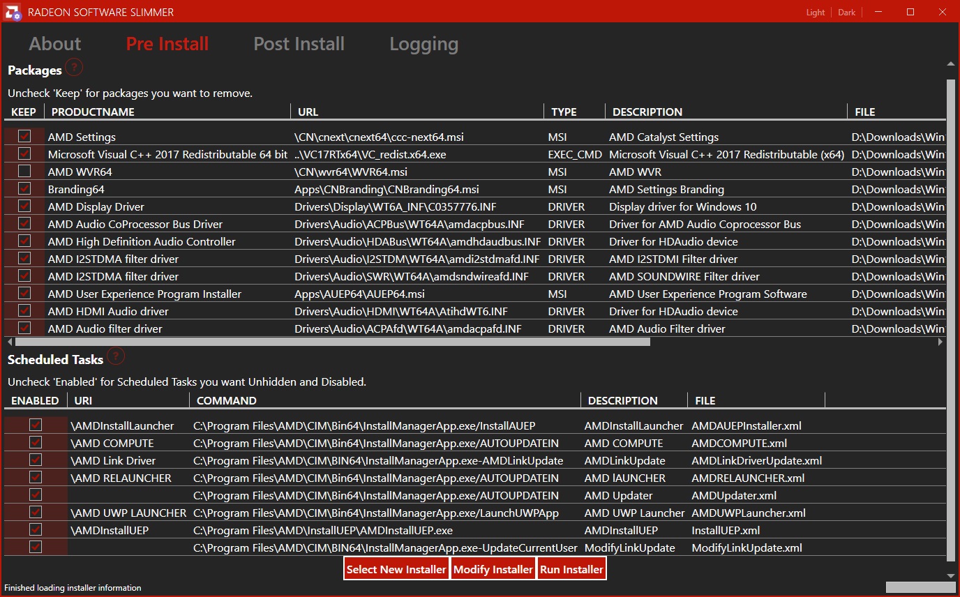 Использование Radeon Software Slimmer простое и интуитивно понятное. В режиме Pre Install пользователь может открыть установочный файл драйвера от AMD и через интерфейс утилиты выбрать, какие именно модули следует установить — например, только драйвер видеокарты и контрольную панель, исключив программу обновления, фоновые службы и ненужные утилиты. В режиме Post Install программа анализирует текущую систему, показывает список активных служб, связанных с Radeon Software, и даёт возможность отключить или удалить те, которые не требуются. Также происходит очистка элементов в Планировщике заданий, оставшихся после инсталляции. Интерфейс утилиты поддерживает переключение цветовой схемы, что делает работу с ней более комфортной в любых условиях.