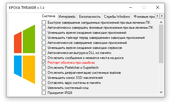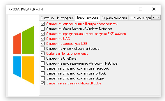 Кроха Tweaker 2.1 — портативная и бесплатная утилита для тонкой настройки операционной системы Windows, созданная разработчиком adnext. Программа позволяет оптимизировать работу системы, отключая ненужные службы, визуальные эффекты и компоненты телеметрии. Подходит как для опытных пользователей, так и для новичков, имея интуитивный интерфейс и подсказки ко всем параметрам.