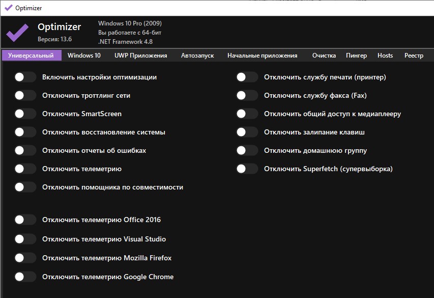 - Полная настройка параметров Windows, включая отключение телеметрии, обновлений и ненужных служб вроде OneDrive и Xbox Live