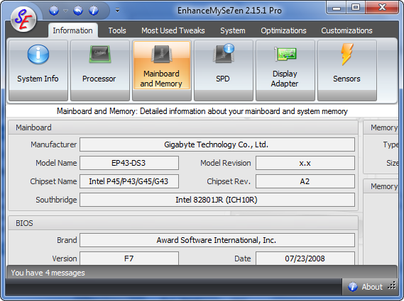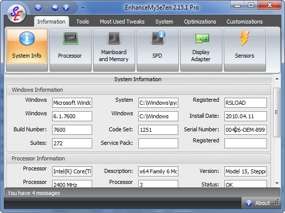 EnhanceMySe7en разработана компанией SeriousBit как специализированный инструмент для адаптации и оптимизации Windows 7 под индивидуальные потребности пользователя. Интерфейс приложения выполнена в интуитивно понятном стиле, с чёткой навигацией по вкладкам, что позволяет быстро находить нужные функции. Программа предоставляет исчерпывающую информацию о системе: данные о процессоре, материнской плате, датчиках температуры, объёме используемой и свободной памяти, состоянии жёстких дисков.