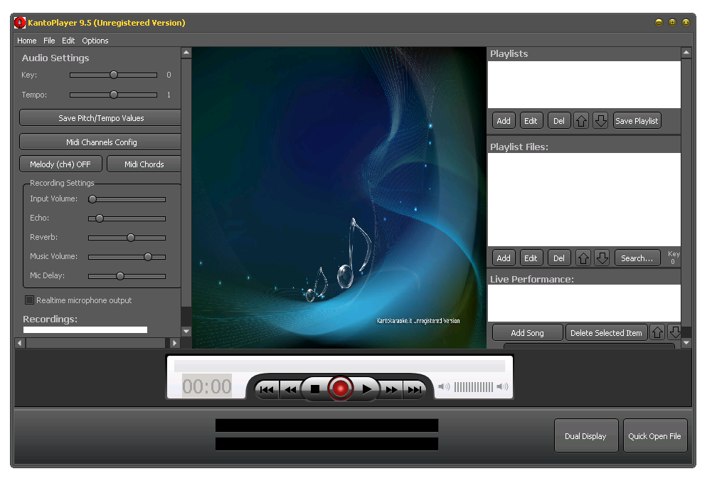 KANTO PLAYER & RECORDER 9.5.0 — универсальное приложение для воспроизведения и записи караоке, совмещающее в себе функции медиаплеера и аудиозаписывающего инструмента. Программа поддерживает широкий спектр форматов, включая MP3, Mid, Kar, Kfn, Mp3 + Cdg, а также видеофайлы с караоке в расширениях .Avi, .Wmv, .Mp4 и других. Возможность записи вокала позволяет пользователям создавать собственные музыкальные композиции с фоновой дорожкой.