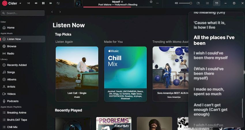 Cider 0.0.1 — это бесплатный клиент Apple Music с открытым исходным кодом, созданный для пользователей Windows. Программа предоставляет прямой доступ к музыкальной библиотеке Apple, позволяя слушать песни, смотреть видео и управлять плейлистами без необходимости использовать iTunes. Удобный интерфейс, поддержка текста песен и компактный режим делают прослушивание комфортным и современным.