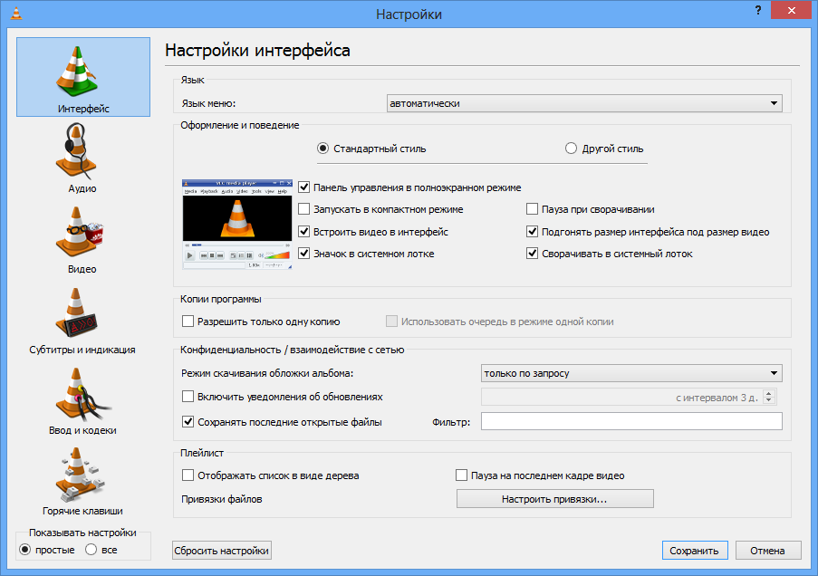- Возможность конвертировать и транслировать видео по сети, а также создавать плейлисты с гибкими настройками очередности.
