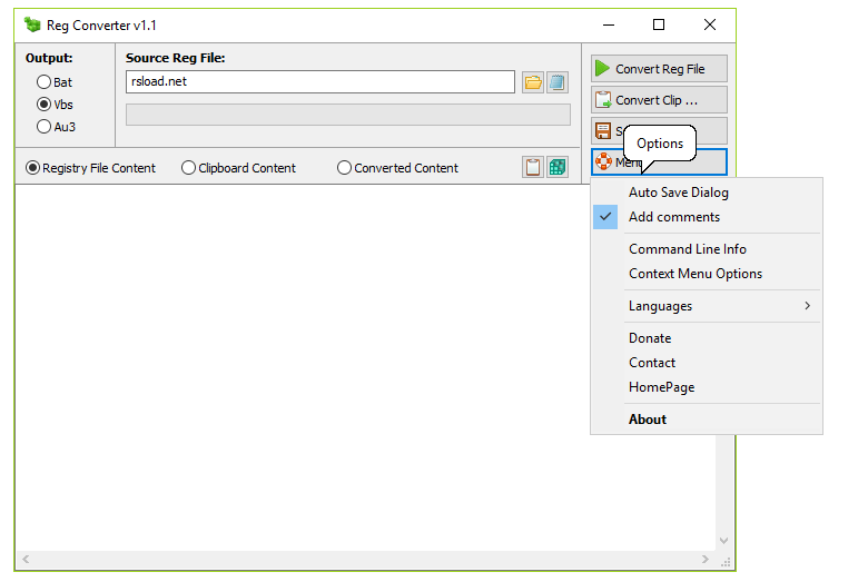 Интерфейс утилиты предельно прост и интуитивно понятен. После запуска достаточно перетащить нужный reg-файл в окно программы или открыть его через меню. Пользователь может вручную отредактировать содержимое реестра, убрать ненужные разделы или добавить новые ключи. Затем выбирается желаемый формат вывода — bat, vbs или au3 — после чего нажимается кнопка «Convert». Результат отображается в окне вывода, откуда его можно сохранить в нужную директорию. Также доступна интеграция с контекстным меню, что ускоряет работу с несколькими файлами.