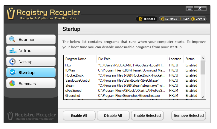 Registry Recycler представляет собой инструмент для комплексной работы с реестром операционной системы, обеспечивающий стабильное функционирование ПК на программном уровне. Программа способна проводить детальное сканирование реестра на наличие поврежденных, устаревших и недействительных записей, возникающих после удаления софта или системных сбоев. Благодаря встроенным алгоритмам обнаружения, она помогает устранить проблемы, влияющие на запуск приложений и общую производительность системы. Одной из ключевых возможностей является функция создания резервных копий реестра перед внесением изменений, что минимизирует риски при выполнении критических операций. Также предусмотрен инструмент дефрагментации, позволяющий упорядочить структуру реестра и ускорить доступ к его записям. Утилита поддерживает редактирование автозагрузки Windows, позволяя управлять списком программ, запускаемых при старте системы, что положительно сказывается на времени загрузки.
