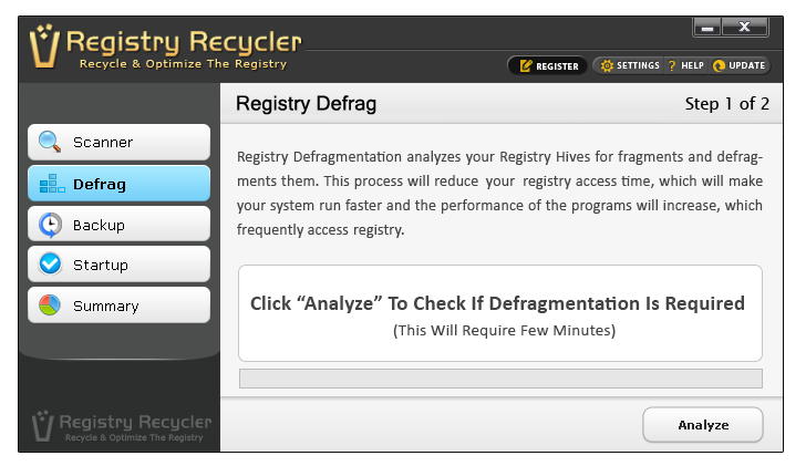 - Выполняет дефрагментацию реестра для повышения скорости его обработки