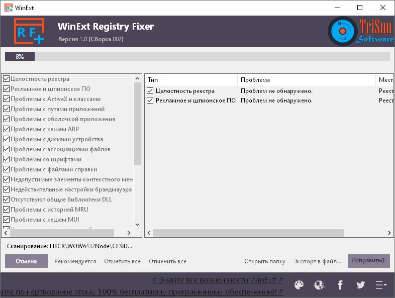 WinExt Registry Fixer разработана компанией TriSun Software Inc и предназначена для комплексной проверки системного реестра на наличие ошибок, повреждённых записей и потенциальных угроз. Утилита способна обнаруживать неверные пути к программам, повреждённые записи ActiveX, некорректные ассоциации файлов и шрифтов, а также ошибки в настройках брандмауэра и контекстного меню. Программное обеспечение поддерживает работу с различными типами реестровых записей, включая кеш MUI, историю MRU и отсутствующие DLL-библиотеки, что делает её эффективным инструментом для системного администрирования и оптимизации.