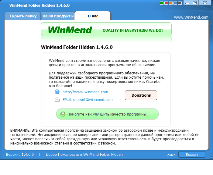 WinMend Folder Hidden 2.4.0 — простое и эффективное приложение для скрытия файлов и папок на компьютере под управлением Windows. Программа позволяет защитить личные данные паролем и делает скрытые объекты недоступными даже при использовании сторонних инструментов или смене операционной системы. Разработчик позиционирует утилиту как решение для домашнего использования, обеспечивая базовую защиту конфиденциальной информации.