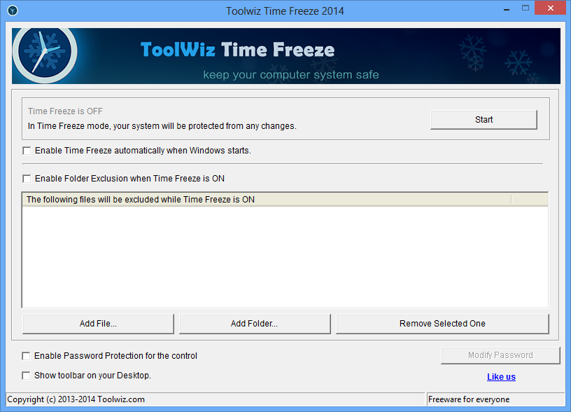Toolwiz Time Freeze — программа для виртуализации системы, обеспечивающая защиту операционной среды от изменений. После активации режима freeze любые действия пользователя, включая установку программ и посещение веб-ресурсов, не затрагивают реальную систему. При перезагрузке computer возвращается в исходное состояние, что делает решение идеальным для публичных и часто используемых устройств. Продукт сочетает в себе простоту использования и высокую эффективность, позволяя настроить защиту с минимальными усилиями.