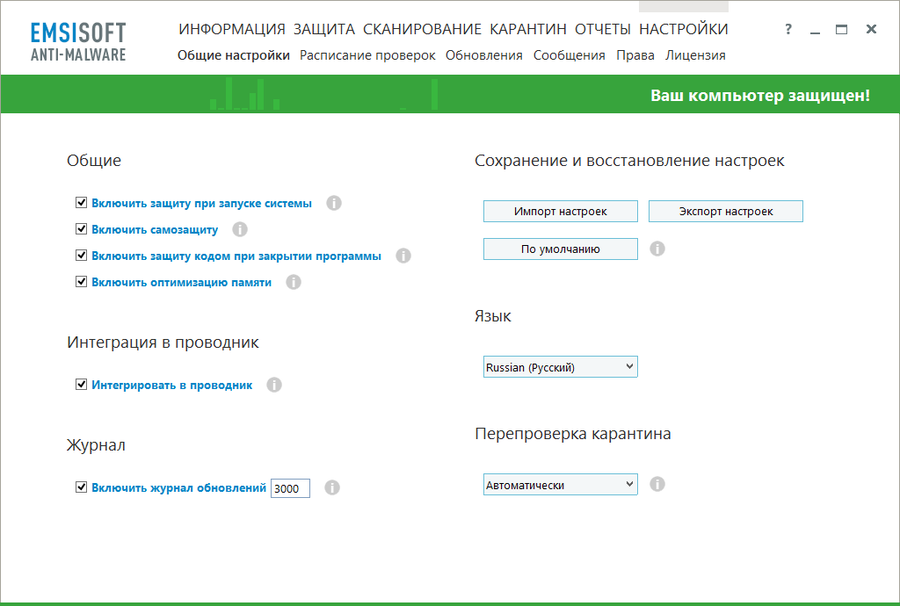Интерфейс Emsisoft Anti-Malware отличается продуманной структурой и логичной навигацией, что упрощает взаимодействие с основными функциями. После установки приложение автоматически запускается и начинает мониторинг системы, не требуя обязательной настройки. Пользователь может запускать полное, выборочное или экспресс-сканирование дисков и папок по своему усмотрению. Все найденные угрозы попадают в карантин, где администратор решает, удалять ли их навсегда или изолировать. Кроме того, предусмотрена защита в реальном времени, которая перехватывает попытки запуска вредоносных сценариев, блокирует доступ к фишинговым сайтам и предотвращает работу кейлоггеров. Наличие русского языка позволяет легко понимать все опции и настройки без необходимости перевода.
