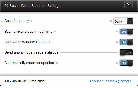 Bitdefender 60-Second Virus Scanner 1.0.3.76 — легковесный инструмент для быстрого поиска вредоносных программ с использованием облачных технологий. Программа позволяет за одну минуту проверить систему на наличие угроз и выдать детализированный отчёт. Решение совместимо с другими антивирусными продуктами и не требует установки.
