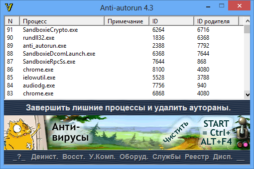 - Эффективно удаляет файлы autorun.inf и аналогичные элементы автозагрузки