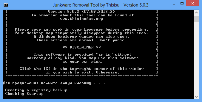 Junkware Removal Tool 8.1.4 — портативная утилита для очистки системы от рекламного, нежелательного и потенциально опасного программного обеспечения. Программа быстро сканирует компьютер, выявляет вредоносные компоненты и помогает полностью удалить junkware. Инструмент не требует установки и автоматически создаёт резервную копию реестра перед внесением изменений.