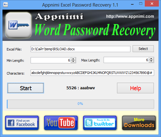 Программа имеет простой интерфейс, где пользователю нужно выбрать защищённый файл Word, настроить параметры перебора и запустить процесс. В разделе настроек указывается минимальная и максимальная длина предполагаемого пароля, а также набор символов, которые будут использоваться в подборе: можно оставить стандартный набор, включающий строчные и прописные латинские буквы, цифры и спецсимволы, или задать свой собственный. После выбора файла и настройки параметров нажимается кнопка Start, и начинается процесс brute force. При высокой сложности пароля время восстановления может составлять часы или даже дни. В ходе работы утилита отображает текущие комбинации и прогресс выполнения.