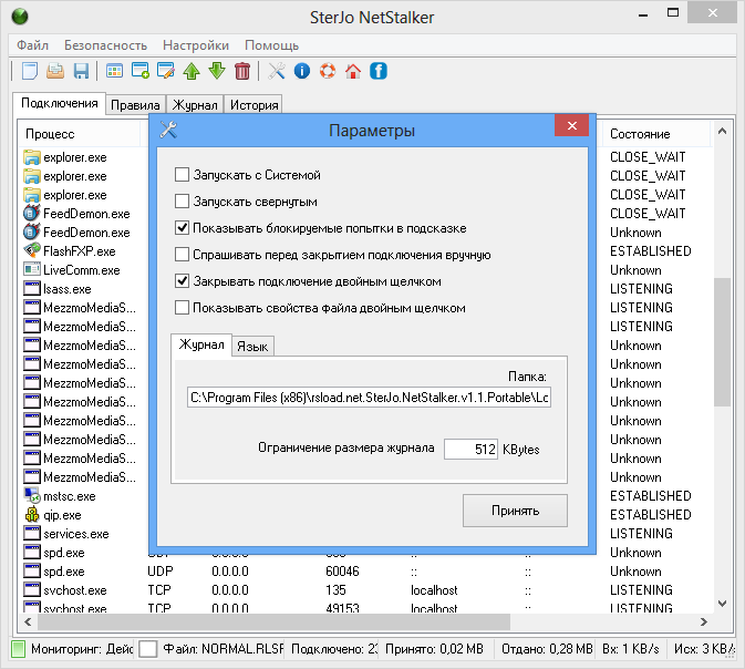 После запуска SterJo NetStalker интерфейс отображает таблицу с информацией о текущих сетевых соединениях. Каждая строка содержит данные о локальном и удалённом адресе, состоянии соединения, а также название процесса, инициировавшего подключение. Пользователь может вручную блокировать конкретное соединение, добавляя его в чёрный список. Настройки позволяют задавать правила фильтрации трафика, например, запрещать подключения к определённым портам или IP. Ведение логов даёт возможность впоследствии анализировать историю сетевой активности, выявлять повторяющиеся атаки и точки уязвимости. Портативная версия работает без установки, сохраняя настройки в локальной папке, что удобно при использовании с флеш-накопителей.