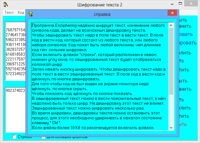 - Программа выполняет шифрование текста любой длины без ограничений по объему.