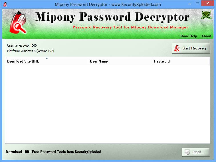 MiponyPasswordDecryptor v2.0 — бесплатная утилита, предназначенная для восстановления сохранённых паролей из файлов Mipony, популярного менеджера загрузки файлов. Программа позволяет быстро получить доступ к премиум-учетным записям, используемым в Mipony для ускоренной и бесперебойной загрузки контента с файлообменников. Разработанная компанией securityxploded, утилита представляет собой простое и эффективное решение для восстановления учетных данных без необходимости вручную искать или перебирать логины и пароли.